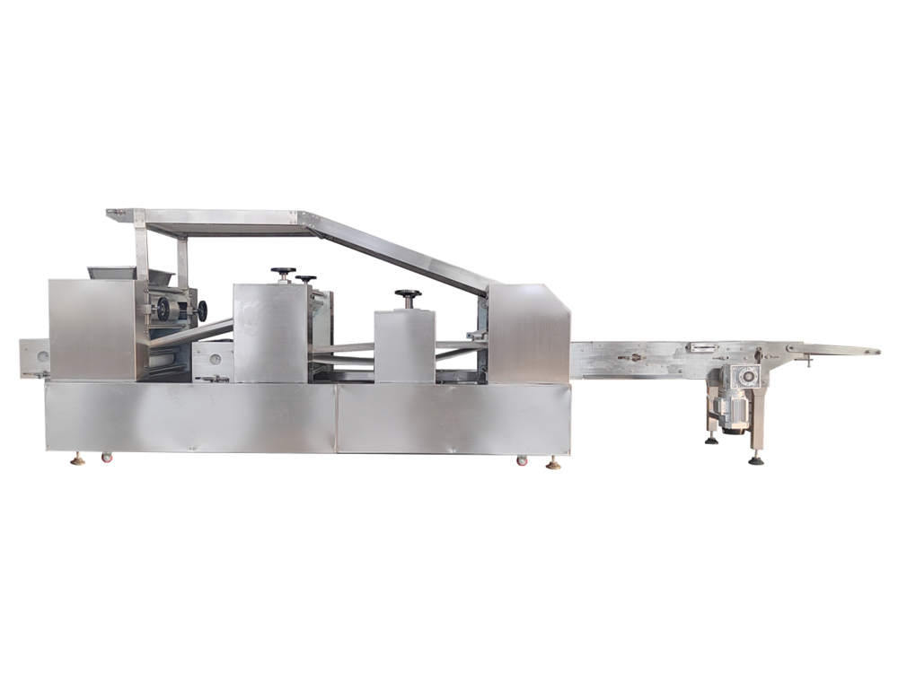 法餅成型機為臥式成型機,通過傳送機構將各道軋輥線速度比合理分配,實現(xiàn)從投料到制皮成型自動化生產(chǎn)。